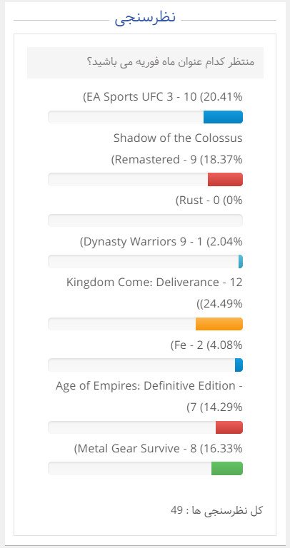 اما نتیجه نظرسنجی هفته گذشته,طی هفته گذشته نظر شما را در رابطه با "منتظر کدام عنوان ماه فوریه می باشید؟"پرسیدیم.طی این نظر سنجی 42 نفر شرکت کرده اند,بازی Kingdom Come: Deliverance با 12 رای و دارا بودن 24.49% در رده اول,EA Sports UFC 3 با 10 رای و 20.41% درصد در رده دوم و Shadow of the Colossus Remastered با 9  رای در رده سوم جای گرفته است.در زیر می توانید نتیجه نظرسنجی هفته گذشته را مشاهده فرمایید.