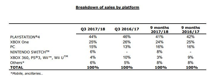 کنسول PS4 با 44 درصد پرسودترین پتلفرم یوبی سافت بوده است,بعد از آن Xbox one با 25 درصد و PC با 15 درصد در جایگاه های دوم و سوم قرار گرفته اند.