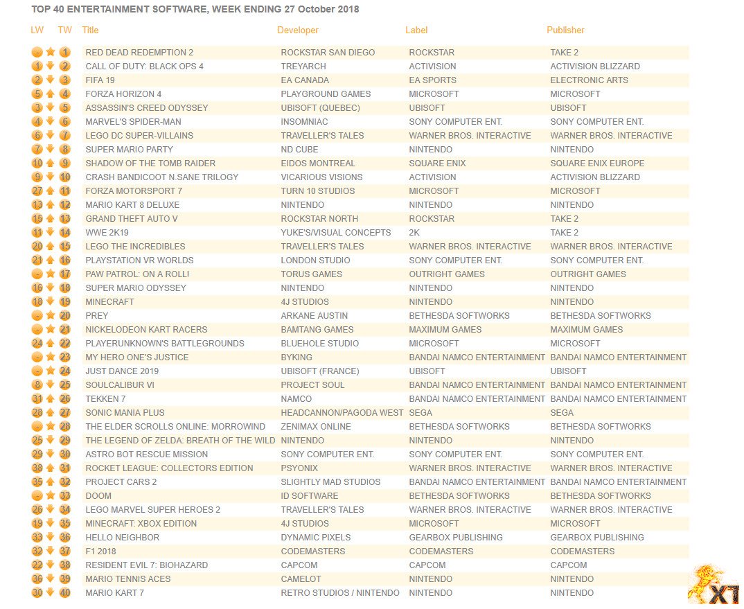 سازمان تحقیقاتی Ukie امروز لیست پرفروشترین بازی های این هفته UK را منتشر کرد.طی این هفته بازی مورد انتظار Red Dead Redemption 2 بعد اینکه توانست بسیار موفق ظاهر شود,جای Call of Duty: Black Ops IIII را در صدر گرفت. لیست پرفروشترین بازی های این هفته به صورت زیر می باشد.
