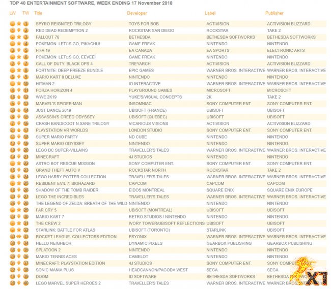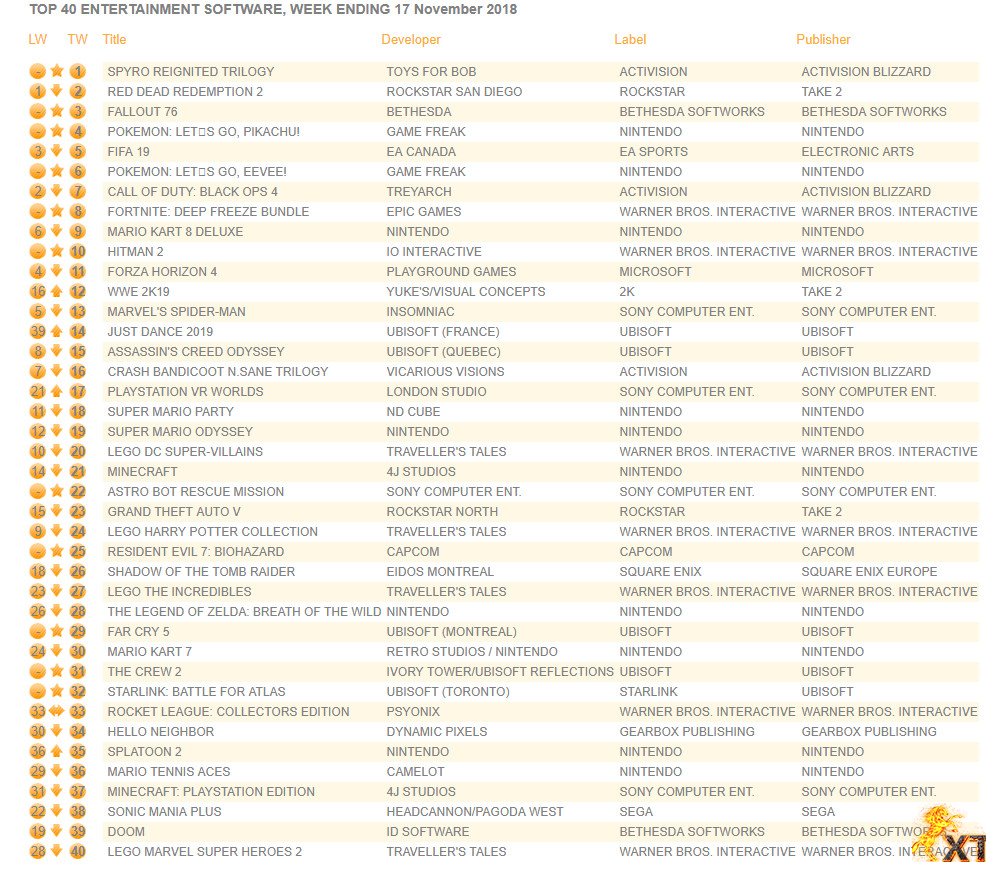 سازمان تحقیقاتی Ukie  امروز لیست پرفروشترین بازی های این هفته UK را منتشر کرد.طی این هفته بازی Spyro Reignited Trilogy که اخیرا منتشر شده بود,در صدر جدول قرار گرفت وبه صدر نشینی بازی Red Dead Redemption 2 پایان داد.