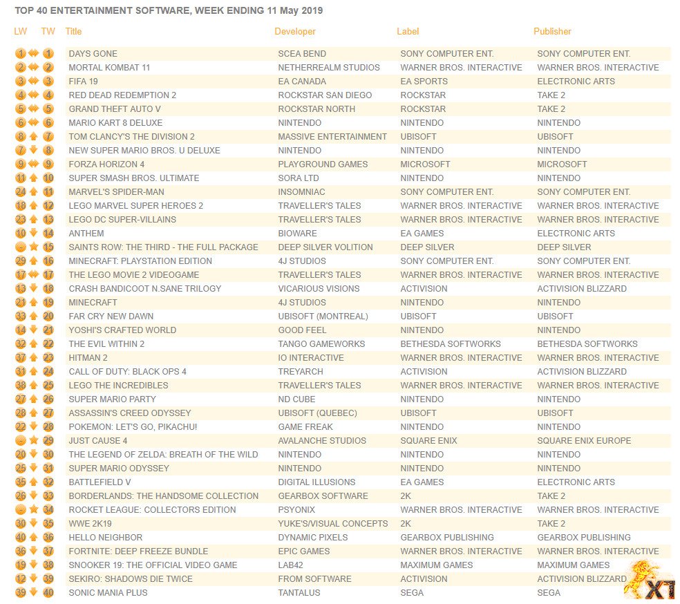 سازمان تحقیقاتی Ukie امروز لیست پرفروشترین بازی های این هفته UK را منتشر کرد.طی این هفته نیز بازی Days Gone توانسته با غلبه بر Mortal Kombat 11 در صدر جدول جای بگیرد.این برای سومین هفته متوالی است که بازی Days Gone توانسته در صدر جای بگیرد.