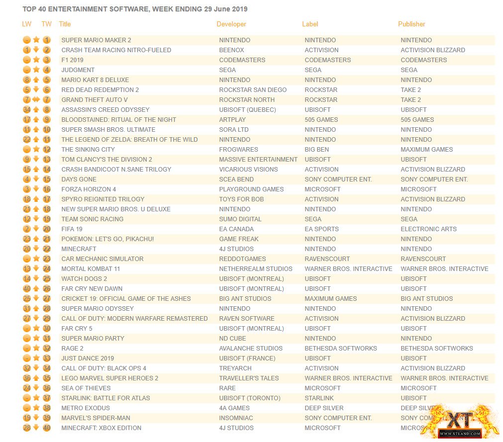سازمان تحقیقاتی Ukie امروز لیست پرفروشترین بازی های این هفته UK را منتشر کرد.طی این هفته بازی Super Mario Maker 2 با به کنار گذاشتن Crash Team Racing Nitro-Fueled که به تازگی منتشر شده است توانسته در صدر جدول جای بگیرد.